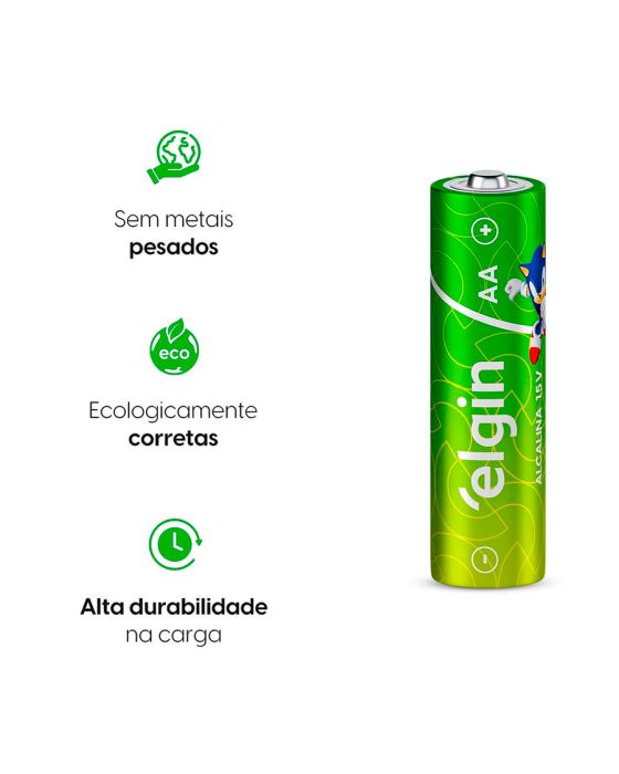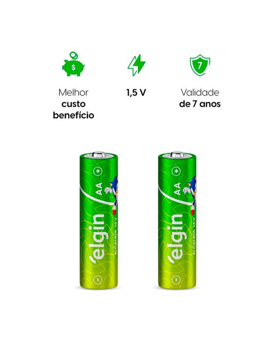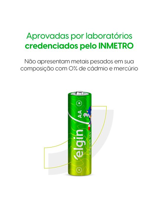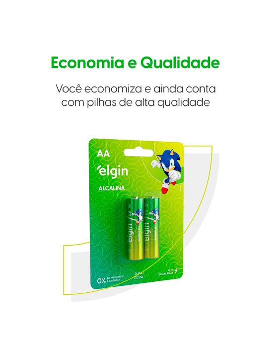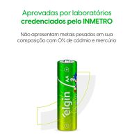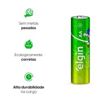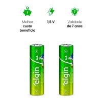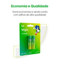 Caracteristícas:As pilhas Alcalinas Elgin são ideais para brinquedos, controle remotos, lanternas e outros aparelhos que requerem descargas rápidas e fortes, foram aprovadas em todos os quesitos e tem custo/benefício excelente, e ainda você economixa com pilhas de qualidade.Além disso, elas são testadas periodicamente por laboratórios credenciados pelo INMETRO, para garantir a qualidade e conformidade com a resolução Conama 401.Detalhes:- Marca: Elgin.- Modelo: 82152.- Linha: Pilhas.- Tipo: Alcalina AA.- Voltagem: 1,5V.- Validade 7 anos.- Contém: 1 Blister com 2 unidades de Pilhas Alcalinas AA.- Alta Durabilidade na Carga.- Aprovadas por laboratórios credenciados pelo INMETRO.- Composição livre de metais pesados que são prejudiciais à saúde.- 0% de Mercurío e Cádmio.Onde usar:- Ideal para uso em aparelhos que requerem descargas de energia rápidas e fortes, como: Brinquedos, Câmeras fotográficas digitais, lanternas, controles, MP3 Players, entre outros.Composição:- Dióxido de Manganês, Zinco, Hidróxido de Potássio, Grafite e Óxido de Zinco.Medidas:- Dimensões: 1,45 x 1,45 x 5,05cm.- Dimensões da embalagem: 10,2 x 9 x 0,2cm.- Peso: 26g.* As especificações podem ser alteradas sem aviso prévio ** Imagem meramente ilustrativa