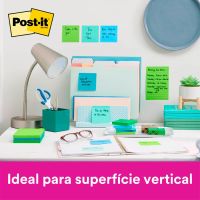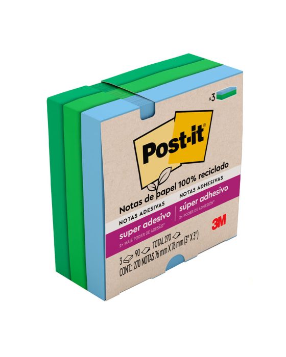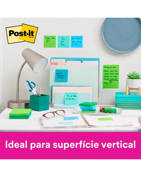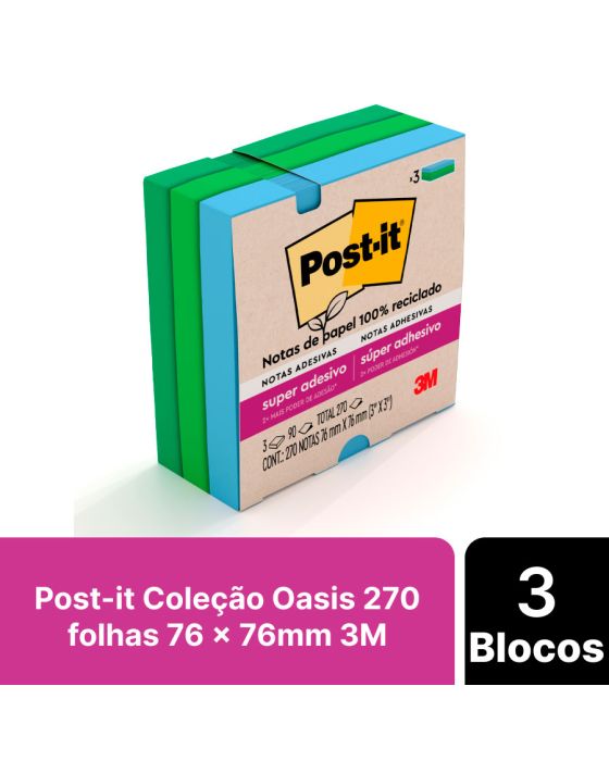 Características:- Organização prática e sustentável para o dia a dia: O Post-it Coleção Oasis 76 x 76 mm 3M é a solução ideal para anotações rápidas, lembretes e organização de tarefas em ambientes pessoais ou profissionais. Com 270 folhas distribuídas em três blocos coloridos nas cores azul, verde claro e verde escuro, proporciona visual moderno e dinâmico, facilitando a categorização de informações e o destaque de recados importantes.- Adesão superior e reutilizável: Desenvolvidas com a tecnologia Super Sticky, as notas Post-it apresentam duas vezes mais adesão que os modelos convencionais, garantindo fixação firme em portas, janelas, paredes, monitores e outras superfícies verticais. Mesmo assim, podem ser reposicionadas várias vezes sem deixar resíduos, preservando a limpeza e a integridade das áreas de uso.- Material ecológico e seguro: Fabricadas em papel 100% reciclado com adesivo acrílico à base de água, as notas oferecem excelente desempenho aliado à sustentabilidade. A embalagem é produzida com materiais recicláveis, reforçando o compromisso ambiental da 3M. O produto é indicado para uso em escritórios, salas de aula, consultórios, residências e qualquer ambiente que exija comunicação visual prática e eficiente.- Versatilidade e conectividade digital: Além de sua aplicação física, o Post-it Coleção Oasis pode ser integrado ao aplicativo gratuito Post-it®, que permite capturar, digitalizar e compartilhar ideias de forma rápida e colaborativa. Essa funcionalidade amplia o uso do produto para o ambiente digital, facilitando o planejamento de projetos, calendários e listas de tarefas.- Marca referência em inovação: A 3M é reconhecida mundialmente pela criação de soluções inteligentes e duráveis que facilitam o cotidiano de pessoas e empresas. - Dimensões da embalagem: Comprimento: 7,7cm; Largura: 7,7cm; Altura: 3,3cm; Peso: 134g.* As especificações podem ser alteradas sem aviso prévio ** Imagem meramente ilustrativa.