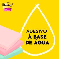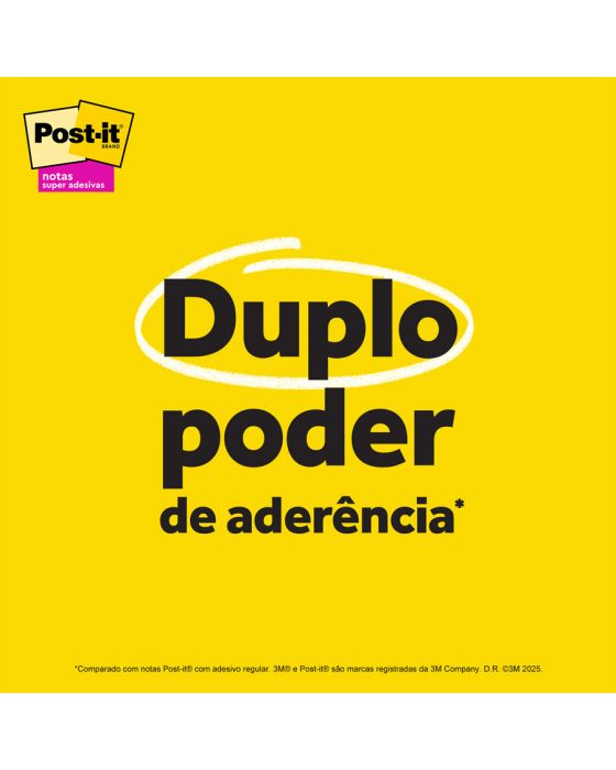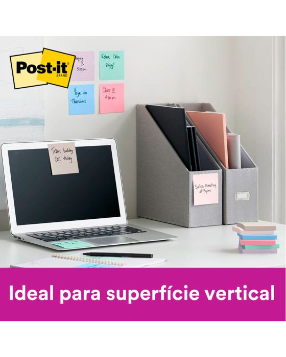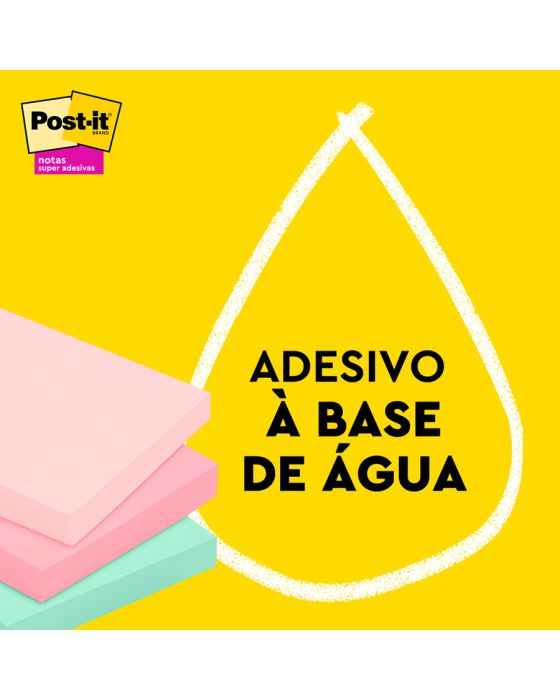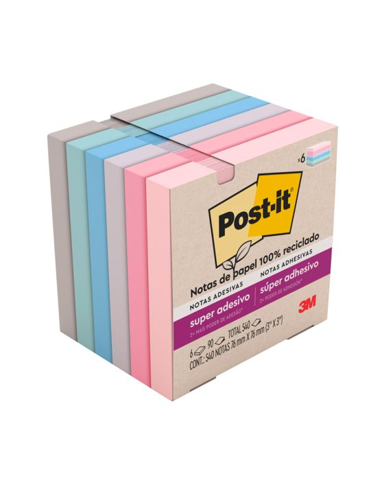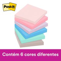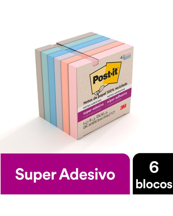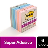 Características:- Notas adesivas com alto desempenho e fixação reforçada: O bloco de notas Post-it® Super Adesivo da Coleção Paixão por Viajar reúne praticidade, sustentabilidade e alta performance em um único produto. Com adesivo reposicionável de base vegetal e 2x mais poder de fixação, permite colar, descolar e recolocar as anotações em diversas superfícies, como portas, janelas, paredes e monitores, sem perder a aderência ao longo do dia.- Formato compacto e cores inspiradas em destinos: Cada bloco contém 90 folhas no formato quadrado de 76 x 76 mm, com tonalidades modernas e suaves: Rosa Milênio, Damasco, Lilac, Azul Céu, Menta e Gris. Com 6 blocos por embalagem (total de 540 folhas), essa coleção é ideal para organizar lembretes, fluxos de tarefas, cronogramas e ideias de forma visualmente agradável.- Aplicações versáteis para uso diário: Perfeito para escritórios, salas de aula, home office e ambientes corporativos, este modelo oferece alta fixação em locais de uso intenso. A função reposicionável permite alterar tarefas e lembretes conforme a necessidade, sem danificar o papel nem a superfície.- Sustentabilidade e responsabilidade ambiental: Produzidas com 30% de papel reciclado, as notas Post-it® Super Adesivas são recicláveis e utilizam matéria-prima proveniente de florestas certificadas, manejadas de forma responsável. - Atenção: O adesivo pode deixar marcas em determinadas superfícies ou remover tinta. Recomenda-se realizar um teste prévio antes do uso definitivo.- Dimensões da embalagem:Comprimento: 8cmLargura: 8cm.Altura: 6,3cm.Peso: 285g.* As especificações podem ser alteradas sem aviso prévio ** Imagem meramente ilustrativa.