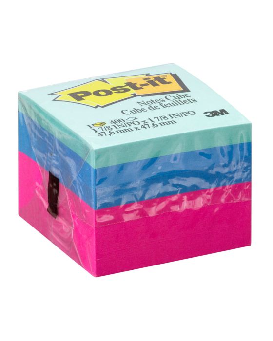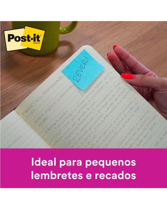 Caracteristicas:O bloco adesivo Post-it® Cubo 47,6 mm x 47,6 mm é ideal para facilitar o seu trabalho do dia-a-dia e te ajuda a se organizar. Com cores sortidas, seu cotidiano ficará mais alegre e colorido.Suas folhas são reposicionáveis, pois possuem adesivo de qualidade 3M que permite que essas sejam retiradas e recolocadas sem danificar papéis ou outras superfícies. Não deixa resíduos do adesivo.Todo papel utilizado nas notas Post-it® é certificado pelo SFI (Chain of Custody Certified), o que garante que vem de florestas bem administradas, onde as árvores são replantadas.Detalhes:- Marca: Post-it®;- Fabricante: 3M;- Modelo: Cubo Ultra;- Referência: HB004434955;- Linha: Notas adesivas;- Tipo: Cubo;- Cor: Rosa, Azul e Verde;- Quantidade de folhas: 400 folhas;- Quantidade de blocos: 1 bloco;- Contém: 1 embalagem com 1 bloco com 400 folhas;- Medidas: 47,6 x 47,6 mm (4,76 x 4,76cm);- Contam com 2x maior poder de adesão;- Com cores sortidas, seu cotidiano ficará mais alegre e colorido;- Reciclável.Aplicações sugeridas:- Ideal para manter o ambiente de trabalho organizado com uma nota sempre ao alcance.Composição:- Papel 75g/m² com adesivo acrílico reposicionável.Aplicativo Post-it:- Reúna suas Notas Post-it®: Capture até 200 Notas Post-it® de uma só vez utilizando a câmera do seu dispositivo. Use seu tamanho de Notas Post-it® preferido;- Crie Quadros: Junte e combine ideias de várias sessões de brainstorms;- Adicione e Edite Notas Digitais: Adicione novas notas ao seu quadro e transforme notas escritas à mão em um texto editável;- Organize do seu jeito: Agrupe suas ideias por temas ou organize-as em uma grade;- Compartilhe facilmente com seus Apps favoritos: Use no PowerPoint®, Excel®, PDF, Dropbox, Trello®, Miro e iCloud®;- Trabalhe em todos os seus dispositivos: O App Post-it® está disponível para IOS, Android e Chromebook.AVISO!- O adesivo pode deixar marcas em algumas superfícies ou remover tinta. Teste antes de usar!Conteúdo da embalagem: 1 Post-it Cubo Ultra 47,6 X 47,6 Mm 400 Folhas 3m.* As especificações podem ser alteradas sem aviso prévio ** Imagem meramente ilustrativa.
