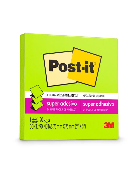 Caracteristicas:O bloco de notas adesivas Post-it® refil 76 mm x 76 mm para o sistema puxa fácil tem o formato parecido com uma sanfona e, quando utilizado junto à linha de suportes sistema puxa fácil para notas, permite que você retire uma nota por vez com apenas uma mão.Suas folhas são reposicionáveis, pois possuem adesivo de qualidade 3M que permite que essas sejam retiradas e recolocadas sem danificar papéis ou outras superfícies. Não deixa resíduos do adesivo.Todo papel utilizado nas notas Post-it® é certificado pelo SFI (Chain of Custody Certified), o que garante que vem de florestas bem administradas, onde as árvores são replantadas.Detalhes:- Marca: Post-it®;- Fabricante: 3M;- Referência: HB004309710;- Linha: Notas adesivas;- Tipo: Refil;- Cor: Verde Neon;- Quantidade de folhas: 90 folhas;- Quantidade de blocos: 1 bloco;- Contém: 1 embalagem com 1 bloco de 90 folhas;- Medidas: 76 x 76mm (7,6 x 7,6cm);- Contam com 2x maior poder de adesão;- Cola, descola e cola novamente para facilitar sua rotina;- O refil para suportes sistema puxa fácil Post-it® são ótimas para retirada de uma nota por vez com apenas uma mão;- Organização garantida sempre com o bloco refil e suporte de nota Post-it®;- Reciclável.Aplicações sugeridas:- O refil deve ser utilizado junto aos suportes sistema puxa fácil Post-it®, já que possui um formato parecido com safona, facilitando a retirada de uma nota por vez com apenas uma mão. Além disso, os suportes são ótimos para dar a sua cara em casa ou no escritório.Composição:- Papel com adesivo com base vegetal reposicionável.AVISO!- O adesivo pode deixar marcas em algumas superfícies ou remover tinta. Teste antes de usar!Conteúdo da embalagem: Post-it Refil Verde Neon 76 X 76 Mm 90 Folhas.* As especificações podem ser alteradas sem aviso prévio ** Imagem meramente ilustrativa.