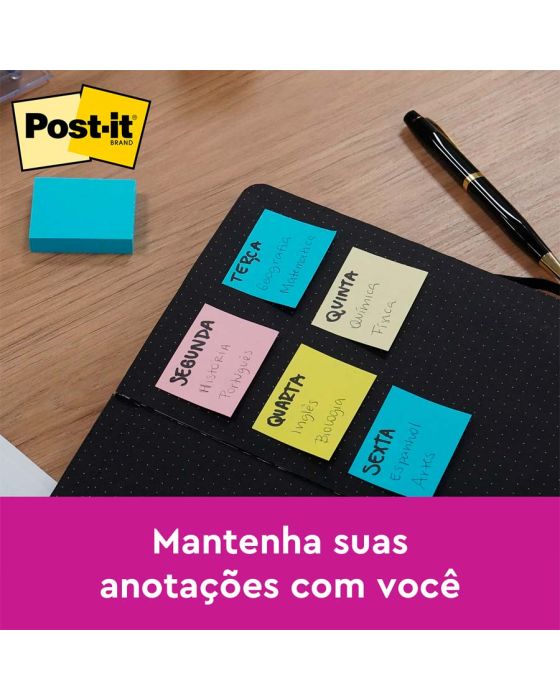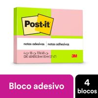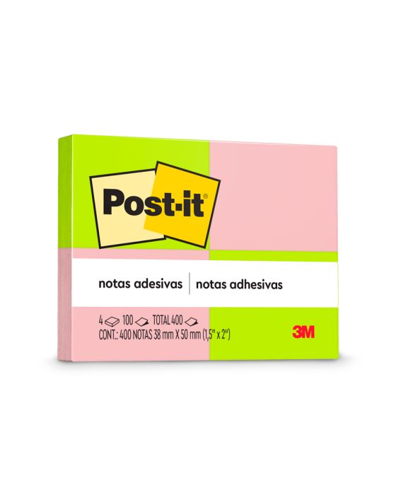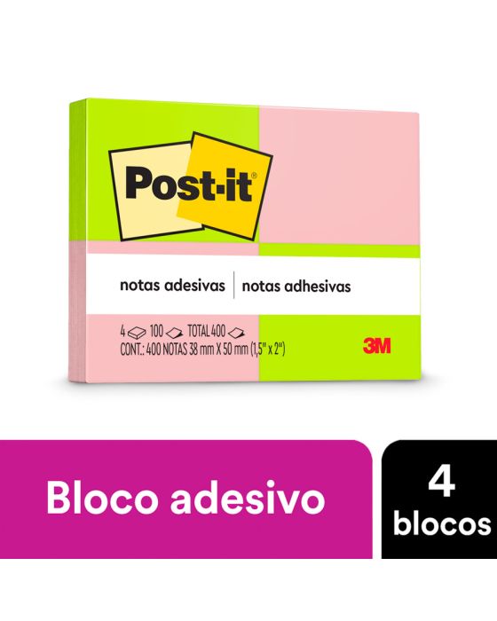 Caracteristicas:As Notas adesivas Post-it® tamanho 38 mm x 50 mm são ideais para pequenos recados e lembretes!Suas folhas são reposicionáveis, pois possuem adesivo de qualidade 3M que permite que essas sejam retiradas e recolocadas sem danificar papéis ou outras superfícies.Detalhes:- Marca: Post-it®;- Fabricante: 3M;- Referência: HB004088314;- Linha: Blocos de nota;- Cor: Verde e Rosa;- Quantidade de folhas: 400 folhas( 100 folhas por bloco);- Quantidade de blocos: 4 blocos;- Contém: 1 embalagem com 4 blocos de 100 folhas cada;- Medidas: 38 x 50 mm (3,8 x 5cm);- Gruda e desgruda: É reposicionavel;- Adesivo ideal para o uso em papel;- Reciclável;- Adesivo de base vegetal.Aplicações sugeridas:- Cores diferentes que facilitam na organização, além de terem o tamanho ideal para anotações rápidas;- Essenciais para organizar sem ocupar grande espaço na mesa do escritório ou sala de aula.Composição:- Adesivo de base vegetal.AVISO!- O adesivo pode deixar marcas em algumas superfícies ou remover tinta. Teste antes de usar!* As especificações podem ser alteradas sem aviso prévio ** Imagem meramente ilustrativa.