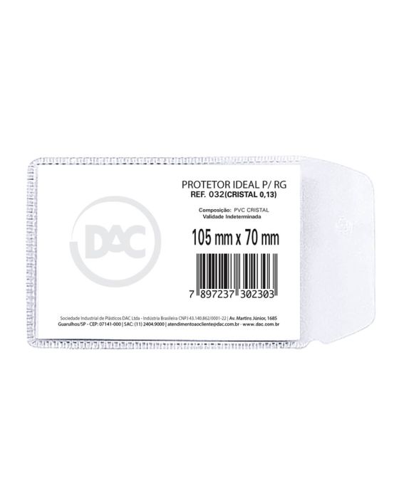 Características:A DAC é líder no segmento de protetores para documentos. Ideal para proteger o CNH e RG, com material de alta durabilidade.!Detalhes:- Marca: DAC;- Modelo: Protetor de Documento Multiuso com aba (CNH);- Referência: 032;- Linha: Protetores de Documentos;- Cor: Transparente/Incolor;- Formato: 7 x 10,5cm;- Espessura: 0,13;- Contém: 1 embalagem com 100 unidades do produto;- Protetor com aba em PVC Cristal.Validade Indeterminada.Ideal para: RG e CNH.Composição:- Fabricado em PVC Cristal.Medidas:- Dimensões do produto: 10,5 x 4cm (CxL).* As especificações podem ser alteradas sem aviso prévio** Imagem meramente ilustrativa.