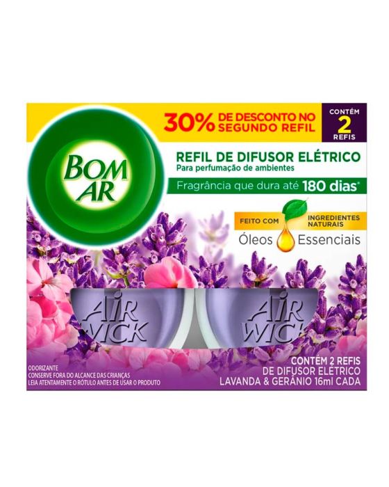 Características:Bom Ar Air Wick Elétrico líquido mantém sua casa uniformemente perfumada com uma fragrância de tecnologia inovadora que se alterna constantemente, trazendo para a sua casa o conforto das pétalas de lavanda, o frescor das frutas vermelhas e o delicado perfume do algodão doce.Detalhes:- Marca: Bom Ar;- Linha: Difusores Elétricos;- Fragrância: Lavanda e Gerânio;- Contém: 2 refil odorizador (30% de desconto na segunda unidade);- Dura até 90 dias (se usado na intensidade mínima);- Com ingredientes naturais e proporcionam sensação de bem estar;- Enquanto estiver na tomada, o Bom Ar® Difusor Elétrico promove perfumação contínua;- Possui 5 níveis de intensidade.Modo de uso:- Remova a tampa do frasco que contém o liquido;- Mantenha o frasco na posição vertical e insira no aparelho até ouvir um click;- Introduza na tomada. Se sua tomada estiver na vertical, gire o plug do aparelho no sentido anti-horário para que ele fique posicionado na vertical;- De acordo com a necessidade, ajuste a intensidade da fragrância - 5 níveis ( Posição mínima duração de 90 dias (12h/dia);- Para retirar o frasco, retire o aparelho da tomada e o puxe-o ligeiramente para baixo.Informações de Segurança:-Perigoso fazer a ingestão do produto. Em caso de ingestão, não provoque vômito e consulte imediatamente o Centro de Intoxicações ou um médico, levando o rótulo do produto.-Evite o contato com os olhos e a pele. Em caso de contato com os olhos e a pele, lave imediatamente com água em abundância.-Evite inalação ou aspiração. Em caso de inalação ou aspiração, remova o paciente para local arejado e consulte imediatamente o Centro de Intoxicações ou um médico, levando o rótulo do produto.-Não aplicar próximo à face.-Não perfure a embalagem vazia.-Mantenha longe do fogo e de superfícies aquecidas.-Não jogue no fogo ou incinerador.-Não exponha à temperatura superior a 50°C.-Cuidado, inflamável! Mantenha longe do fogo e de superfícies aquecidas.-Não reutilize a embalagem vazia.-Mantenha o recipiente hermeticamente fechado em lugar fresco e ventilado.-Mantenha o produto na embalagem original.* As especificações podem ser alteradas sem aviso prévio ** Imagem meramente ilustrativa