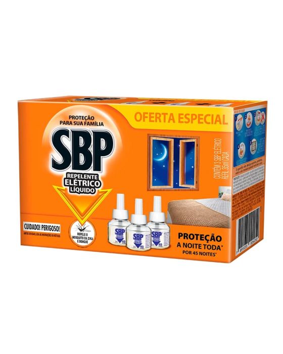 Características:O SBP Repelente Elétrico Líquido refil 45 Noites 35ml com 3 unidades é a maneira de repor o repelente elétrico de uma forma mais econômica e inteligente. Protege o ambiente por até 45 noites (considerando o uso de 8 horas por dia), e mantém afastados mosquitos e pernilongos, incluindo o Aedes aegypti, transmissor da Dengue, Zika e Chikungunya, proporcionando noites tranquilas.Detalhes: - Marca: SBP;- Modelo: 45 Noites;- Linha: Repelente Elétrico;- Quantidade: 3 unidades de refil de 35ml cada frasco;- Contém: 1 embalagem com 3 unidades do produto de 35ml cada;- Proteção a qualquer hora do dia;- Mantém afastado o mosquito da Dengue, Zika e Chikungunya para noites tranquilas;- Proteção a noite toda por 45 noites, considerando o uso de 8 horas por dia.Eficaz contra: - Pernilongos e mosquitos;- Moscas;- Aedes Aegypti.Modo de uso: - Com o refil líquido do SBP Repelente Elétrico em mãos, remova cautelosamente sua tampa para utilização;- Insira o refil no aparelho, e gire-o para direita para encaixá-lo (não acompanha o aparelho, vendido separadamente);- Coloque o repelente elétrico na tomada (110-240V-5W), sempre na posição vertical. Caso sua tomada esteja na vertical, basta girar o plug do próprio aparelho para ajustar;- Ajuste a intensidade do repelente, girando a região laranja do aparelho;- É necessário manter uma porta ou janela entreaberta durante o funcionamento do produto para que os mosquitos possam sair;- Quando utilizado no quarto, mantenha o repelente elétrico ligado em uma distância mínima de 2 metros da cabeceira da cama.Recomendações:- Utilizar o produto mantendo uma pequena abertura na porta ou janela para que o mosquito possa sair.Composição:- Transflutrina 0,8%, Solventes e Antioxidante.Conservação:- Conservar o frasco do repelente líquido bem fechado, em local fresco e ventilado;- Manter o produto em embalagem original.ATENÇÃO! CONSERVE FORA DO ALCANCE DAS CRIANÇAS E DOS ANIMAIS DOMÉSTICOS.* As especificações podem ser alteradas sem aviso prévio ** Imagem meramente ilustrativa.