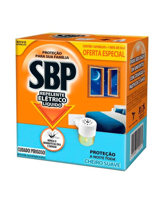 Características:O SBP Repelente Elétrico Líquido Cheiro Suave mantém afastado do ambiente pernilongos e mosquitos, incluindo o Aedes aegypti, mosquito transmissor da Dengue, Zika e Chikungunya por até 45 noites (considerando o uso de 8 horas por dia), com suavização de odores em sua composição. Basta plugá-lo na tomada e sua família ficará protegida, proporcionando noites tranquilas.- Proteção a qualquer hora do dia.- Possui cheiro mais suave que a versão regular.- Mantém afastado o mosquito da Dengue, Zika e Chikungunya para noites tranquilas.- Proteção a noite toda por 45 noites, considerando o uso de 8 horas por dia.- Utilizar o produto mantendo uma frecha na porta ou janela para que o mosquito possa sair.Ingredientes ativos:- Transflutrina 0,8%, Solventes e Antioxidante.Instruções de armazenamento:- Conservar o frasco do repelente líquido bem fechado, em local fresco e ventilado. Manter o produto em embalagem original.Informações de segurança:- CONSERVE FORA DO ALCANCE DAS CRIANÇAS E DOS ANIMAIS DOMÉSTICOS. CUIDADO: PERIGOSA SUA INGESTÃO, INALAÇÃO OU ABSORÇÃO PELA PELE. Não aplicar sobre alimentos e utensílios de cozinha, plantas e aquários. Não fumar ou comer durante a aplicação. Não jogue no fogo ou incinerador. Perigoso se aplicado próximo a chamas ou superfícies aquecidas. Não reutilizar as embalagens vazias. Não jogar as embalagens em rios e lagos. Não mexa no refil com o aparelho ligado. Não pegue no refil com o aparelho ligado. Não introduza objetos e nem o cubra. Lavar as mãos com água e sabão depois de tocar o refil. Manter a cabeça a uma distância mínima de 2 metros do ponto de liberação do produto. Pode ser fatal se ingerido. Em caso de ingestão acidental, não provoque o vômito. Este produto não deve ser utilizado em ambientes com pouca ventilação, nem na presença de pessoas asmáticas ou com alergias respiratórias. CUIDADOS EM CASO DE ACIDENTE: se inalado em excesso, remover a pessoa para local ventilado. Em caso de contato direto com o produto, lavar a parte atingida com água em abundância e sabão. Em caso de contato com os olhos, lavar imediatamente com água corrente em abundância. Em caso de intoxicação, procurar o Centro de Intoxicações ou Serviço de Saúde, levando a embalagem ou o rótulo do produto. O aparelho é apenas recomendado para ser usado como meio de vaporização. O uso de outras substâncias pode dar origem a um risco tóxico ou fogo. NÃO GARANTIMOS SEGURANÇA E PERFORMANCE DE 45 NOITES NO USO DE APARELHO, E REFIL DE MARCAS DIFERENTES. RECOMENDA-SE QUE AS CRIANÇAS SEJAM VIGIADAS PARA ASSEGURAR QUE ELAS NÃO ESTEJAM BRINCANDO COM O APARELHO. RETIRAR O APARELHO DA TOMADA GUARDANDO-O EM LOCAL SEGURO ATÉ A PRÓXIMA UTILIZAÇÃO. Este aparelho não deve ser utilizado por pessoas (incluindo crianças) com capacidades físicas, sensoriais ou mentais reduzidas, ou sem experiência e conhecimento, a menos que sejam supervisionadas ou instruídas em relação ao uso do aparelho por alguém que seja responsável por sua segurança.* As especificações podem ser alteradas sem aviso prévio ** Imagem meramente ilustrativa