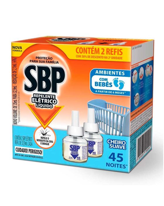 Características:O SBP Repelente Elétrico Líquido Cheiro Suave mantém afastado do ambiente pernilongos e mosquitos, incluindo o Aedes aegypti, mosquito transmissor da Dengue, Zika e Chikungunya por até 45 noites (considerando o uso de 8 horas por dia), com suavização de odores em sua composição. Basta plugá-lo na tomada e sua família ficará protegida, proporcionando noites tranquilas.Detalhes:- Marca: SBP;- Modelo: SBP Repelente Elétrico Líquido Cheiro Suave;- Linha: Repelente Elétrico;- Quantidade: 450ml;- Contém: 1 unidade do produto;- Proteção a qualquer hora do dia;- Possui cheiro mais suave que a versão regular;- Mantém afastado o mosquito da Dengue, Zika e Chikungunya para noites tranquilas;- Proteção a noite toda por 45 noites, considerando o uso de 8 horas por dia;- Utilizar o produto mantendo uma frecha na porta ou janela para que o mosquito possa sair.Modo de uso:- Com o refil líquido do SBP Repelente Elétrico em mãos, remova cautelosamente sua tampa para utilização;- Insira o refil no aparelho, e gire-o para direita para encaixá-lo;- Coloque o repelente elétrico na tomada, sempre na posição vertical. Caso sua tomada esteja na vertical, basta girar o plug do próprio aparelho para ajustar;- Ajuste a intensidade do repelente, girando a região laranja do aparelho;- É necessário manter uma porta ou janela entreaberta durante o funcionamento do produto para que os mosquitos possam sair;- Quando utilizado no quarto, mantenha o repelente elétrico ligado em uma distância mínima de 2 metros da cabeceira da cama.Conservação:- Conservar o frasco do repelente líquido bem fechado, em local fresco e ventilado; - Manter o produto em embalagem original.Composição:- Transflutrina 0,8%, Solventes e Antioxidante.CUIDADO! PERIGOSA SUA INGESTÃO, INALAÇÃO OU ABSORÇÃO PELA PELE.CONSERVE FORA DO ALCANCE DAS CRIANÇAS E DOS ANIMAIS DOMÉSTICOS.* As especificações podem ser alteradas sem aviso prévio ** Imagem meramente ilustrativa