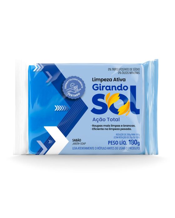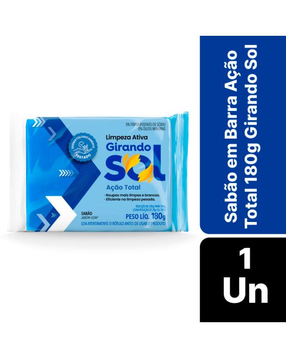 Características:- Eficiência e cuidado em cada lavagem: O Sabão em Barra Girando Sol Ação Total 180g foi desenvolvido para garantir uma limpeza profunda com alto desempenho e respeito ao meio ambiente. Sua fórmula biodegradável permite que o produto se decomponha naturalmente, sem causar impactos negativos à natureza. Além disso, é dermatologicamente testado, o que assegura segurança no uso diário, tanto em roupas quanto em utensílios domésticos.- Poder de limpeza pesada e versatilidade de uso: Com ação multiuso, o sabão Girando Sol é indicado para a remoção de sujeiras difíceis, oferecendo excelente rendimento e alto poder de espuma. Ideal para lavagem de roupas brancas e coloridas, garante tecidos mais limpos, perfumados e com aparência renovada. Também é eficiente na higienização de utensílios e superfícies, removendo gordura e resíduos com facilidade. Sua fórmula contém extrato de algodão e glicerina, que ajudam a preservar a maciez das mãos e a integridade dos tecidos, mesmo em limpezas mais intensas.- Fórmula segura e sustentável: O Sabão Girando Sol Ação Total é livre de tripolifosfato de sódio e óleos minerais, reduzindo o impacto ambiental e tornando-se uma opção mais ecológica para o uso doméstico. Sua composição equilibrada une agentes alcalinos e sequestrantes que potencializam a ação de limpeza, sem agredir superfícies ou tecidos. O produto apresenta coloração azul, símbolo de sua pureza e eficiência comprovada.- Modo de uso prático e eficaz: Para roupas: esfregue o sabão diretamente sobre a peça umedecida e prossiga com a lavagem habitual. Para utensílios: aplique uma pequena quantidade em uma esponja úmida, esfregue o objeto e enxágue bem.- Girando Sol: tradição e qualidade em produtos de limpeza: A Girando Sol é uma marca brasileira reconhecida pela fabricação de produtos de limpeza doméstica com alto padrão de qualidade e compromisso ambiental.- Dimensões da embalagem:Comprimento: 8,5cm;Largura: 5cm;Altura: 3,5cm;Peso: 1,013kg.ATENÇÃO! MANTENHA FORA DAS CRIANÇAS E DOS ANIMAIS DOMÉSTICOS.* As especificações podem ser alteradas sem aviso prévio ** Imagem meramente ilustrativa.