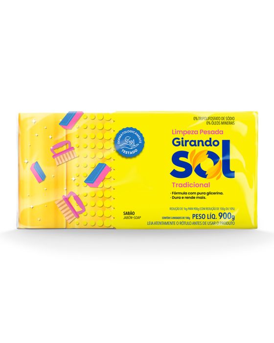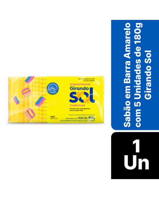Características:O Sabão é um produto de limpeza essencial para manter nossa casa limpa e organizada, já que ele desempenha um papel fundamental na manutenção da higiene e na remoção de sujeira e manchas. Por isso, a Girando Sol desenvolveu os sabões em barra para facilitar ainda mais a rotina do seu dia a dia com melhores resultados.Detalhes:- Marca: Girando Sol;- Modelo: Limpeza Pesada;- Linha: Sabão em barra;- Cor: Amarelo;- Peso: 900g;- Quantidade de barras: 5 barras de 180g cada;- Contém: 1 embalagem com 5 unidades do produto;- Dermatologicamente testado;- Fórmula com pura glicerina;- Dura e rende mais;- Água pode faltar, não desperdice.Indústria Brasileira. | Validade: 24 meses após a data de fabricação.Modo de usar:- Esfregue o sabão Girando Sol sobre a roupa umedecida;- Na limpeza de utensílios, aplique uma pequena quantidade sobre uma esponja umedecida e esfregue no objeto a ser limpo;- Em ambos os casos, enxágue em seguida.Conservação:- Conservar em local seco e fresco.Recomendações:- Não ingerir;- Evite o contato prolongado com a pele depois de utilizar este produto.Composição:- Sebo Bovino, Glicerina, Alcalinizante, Sequestrante, Cargas, Corante, Fragrância e Veículo.Medidas:- Dimensões da embalagem: 18 x 5 x 8cm (CxLxA);- Dimensões da barra (cada): 8,5 x 5 x 3,5cm (CxLxA);- Peso embalagem: 900g;- Peso barra (cada): 180g.ATENÇÃO! MANTENHA FORA DAS CRIANÇAS E DOS ANIMAIS DOMÉSTICOS.* As especificações podem ser alteradas sem aviso prévio ** Imagem meramente ilustrativa.