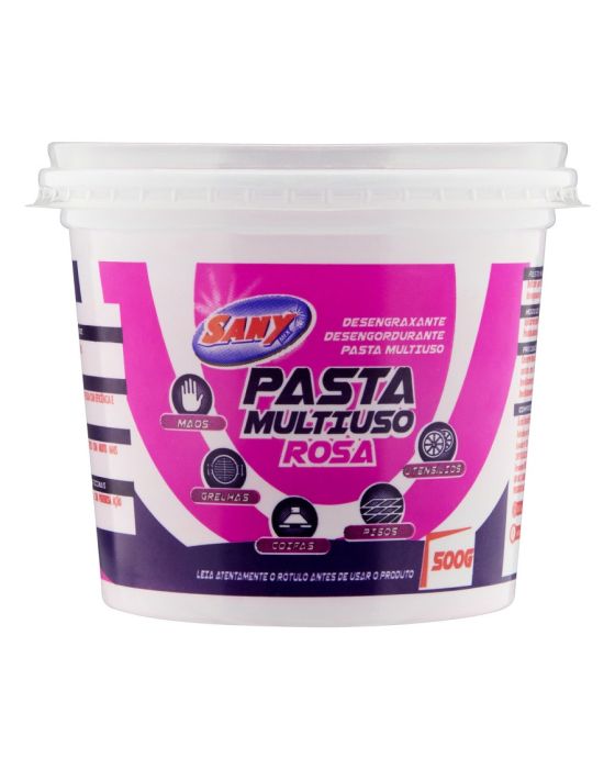 Características:A Pasta Multiuso Rosa é o poderoso desengordurante da linha Sany Mix! Indicado para limpeza de pesada em geral, principalmente em mármores, pisos e azulejos, a Pasta Multiuso Rosa tem ação desengraxante e polidora.O poder da limpeza com a sutileza do lar!Detalhes:- Marca: Sany.- Modelo: Pasta Multiuso Rosa.- Linha: Sabão em pasta.- Cor: Rosa.- Odor: Limão.- Volume/Peso: 500g.- Contém: 1 unidade do produto.- Ação desengraxante e polidora- Limpeza pesada.Indicada para: - Limpeza de Grelhas, Coifas, Pisos e Utensílios.Conservação: - Manter as embalagens fechadas, em local seco e ventilados, ao abrigo da luz solar.- Manter o produto em sua embalagem original.Composição:- Ingrediente ativo: Ácido Dodecilbenzeno Sulfônico.ATENÇÃO! Leia atentamente o rótulo antes de usar o produto.* As especificações podem ser alteradas sem aviso prévio **Imagem meramente ilustrativa.