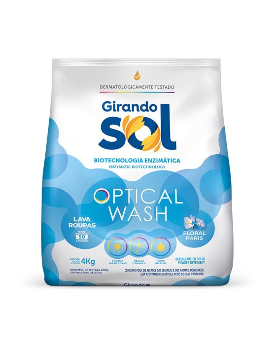 Características - Detergente em Pó Girando Sol - Sachê de 4K - Cor: Azul / Floral Paris - Produto Ecológico - NÃO CONTÉM TRIPOLIFOSFATO DE SÓDIO. - Produto Biodegradável - Preserva o oxigênio das águas. - Cuida e perfuma suas roupas. - Com enzimas superativas. - Para todo tipo de máquina.Modo de Usar - Leia as instruções na etiqueta da roupa. - Separe as roupas brancas das coloridas. - IMPORTANTE: Para aproveitar ao máximo o seu produto e obter os melhores resultados de limpeza, rendimento e perfumação, use sempre a dosagem recomendada. - ATENÇÃO: não coloque o produto direto sobre o tecido. Dissolva-o na água e depois coloque a roupa. - Para obter melhores resultados, recomenda-se deixar a roupa de molho por 1 hora. - Nunca deixe suas roupas de molho ao sol. - Seque as roupas brancas à luz natural e as coloridas à sombra.Precauções - CONSERVE FORA DO ALCANCE DAS CRIANÇAS E DOS ANIMAIS DOMÉSTICOS. - Não ingerir. - Evite inalação ou aspiração, contato com os olhos. - Evite o contato prolongado com a pele. - Depois de utilizar este produto, lave e seque as mãos. - Em caso de contato com os olhos ou com a pele, lave imediatamente com água em abundância. - Em caso de ingestão, não provoque vômito e consulte imediatamente o Centro de Intoxicações ou o médico, levando o rótulo do produto. - Manter o produto em sua embalagem original. - Não reutilizar a embalagem vazia para outros fins. Composição Química - Composição: Tensoativo Aniônico, Coadjuvantes, Sinergistas, Branqueadores Ópticos, Enzimas, Corante, Fragrância e Água. - Princípio Ativo: Dodecil Benzeno Sulfonato de Sódio. * As especificações podem ser alteradas sem aviso prévio ** Imagem meramente ilustrativa