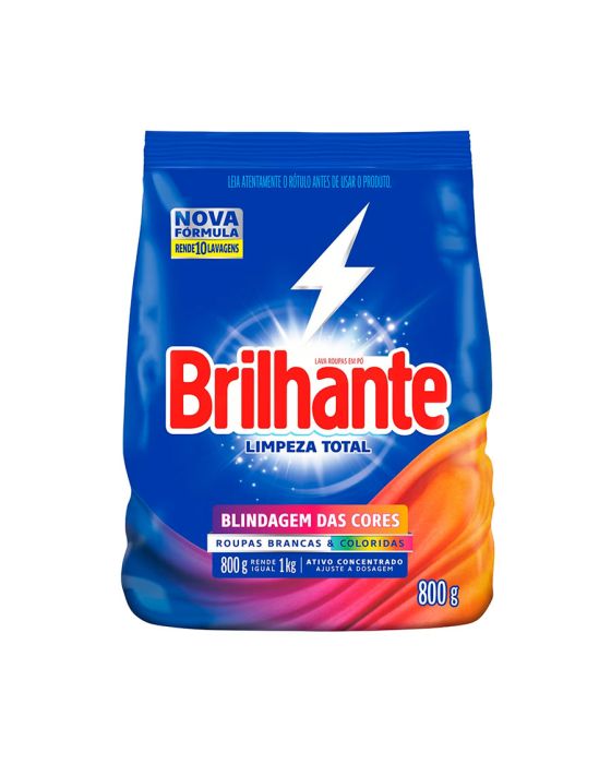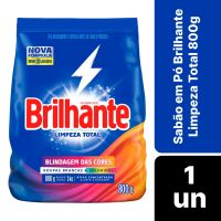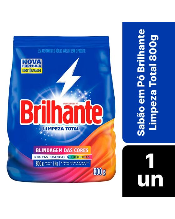 Características:O novo sabão em pó Brilhante Limpeza Total limpa as roupas brancas e coloridas enquanto cuida das cores. A nova fórmula contém o poder das enzimas, proporcionando uma limpeza profunda e evitando que a sujeira se deposite novamente nas roupas.Além disso, Brilhante Limpeza Total mantém suas roupas novas por mais tempo, prevenindo os sinais de desgaste das suas peças preferidas e protegendo do desbotamento. Ainda possui a tecnologia Brilho Ativo que evita o amarelamento das roupas brancas. Entre limpeza profunda e proteção das cores? Escolha os dois! Com Brilhante Limpeza Total, você sempre leva mais.Brilhante quer se tornar um aliado nas tarefas diárias dos loucos por lavar roupas, com isso busca trazer praticidade através de produtos inovadores e que todo mundo possa usar, diminuindo o peso das tarefas e liberando tempo para as demais atividades do dia a dia.Detalhes:- Marca: Brilhante;- Fabricante: Unilever;- Modelo: Limpeza total;- Linha: Sabão em pó;- Volume/Peso: 800g;- Contém: 1 unidade do produto;- Nova fórmula: rende até 10 lavagens;- Blindagem das Cores: Roupas brancas e coloridas;- Com tecnologia Brilho Ativo;- Brancos impecáveis;- Cuida das cores;- Roupas novas por mais tempo;- 800g rende igual 1kg.Modo de uso:- Meia xícara de chá (240ml) lava uma máquina cheia (máquina de abertura superior).Recomendações: - Não ingerir;- Evite a inalação ou aspiração;- Evite o contato prolongado com a pele;- Depois de utilizar Brilhante Limpeza Total, lave e seque as mãos;- Para conservar as propriedades do produto, mantenha a embalagem fechada e em local seco e fresco;- Não reutilize a embalagem para outros fins.Composição:- Tensoativo Aniônico, Tamponantes, Coadjuvantes, Sinergista, Corante, Enzimas, Branqueador Óptico, Fragrâncias e Cargas. Princípio Ativo: Alquil Benzeno Sulfonato de Sodio;- Contém Tensoativo Biodegradável.ATENÇÃO! MANTENHA FORA DO ALCANCE DAS CRIANÇAS E DOS ANIMAIS DOMÉSTICOS.* As especificações podem ser alteradas sem aviso prévio ** Imagem meramente ilustrativa.
