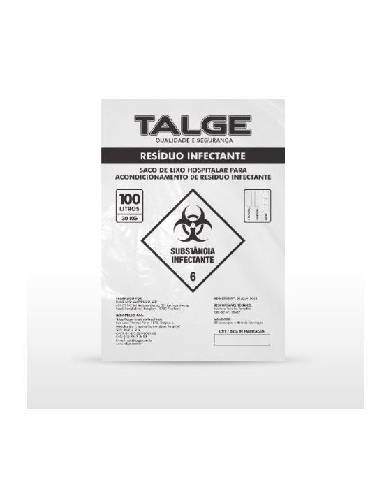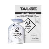 Características:Indicações e Instruções de Uso:O saco de lixo hospitalar para acondicionamento de resíduo infectante é indicado único e exclusivamente para acondicionamento de materiais e resíduos infectantes hospitalares descartados em geral, oriundos de hospitais, centros de saúde, clínicas de saúde e serviços de saúde em geral. Produto de uso simples e único. - Saco de Lixo para produtos infectantes - Litragem: 100 litros - Capacidade: 30 Kilos - Micragem: 5 micras / 0,020µ - Saco na Cor branca - Composição: Polietileno de alta densidade. - Pacote com 100 unidades - Marca: Talge - Medidas: 75X105CM - ABNT NBR 9191:2008. * As especificações podem ser alteradas sem aviso prévio ** Imagem meramente ilustrativa.