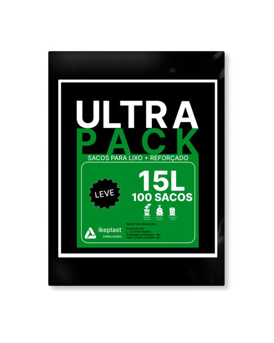 Características:Os Sacos Plásticos de 15 litros na cor preta são ideais para coletas seletivas e acondicionamento de lixo de sua casa e empresa.Os Sacos de Lixo Ultra Pack estão disponíveis também nas opções: 30L, 100L, 150L, 200L e 300L em nosso site!Detalhes:- Marca: Ultra Pack.- Linha: Saco de lixo.- Tipo: Leve.- Cor: Preto.- Litros: 15 Litros.- Capacidade: 3kg.- Contém: 1 embalagem com 100 sacos plásticos.- Micras: 3 Micras.- Classe 1, tipo E.- Resíduo Normal.Indústria Brasileira.Ideal para:- Ideal para Hospitais, Hotéis, Indústrias, Consultórios, Clínicas, Restaurantes, Shopping Centers, Condomínios, Faculdades, Escolas e muito mais.Uso:- Uso exclusivo para acondicionamento/descarte de lixo.Medida:- 39 x 545cm.ATENÇÃO! Cuidado com o uso indevido por crianças, colocando o saco plástico a cabeça poderá asfixiá-la e provocar acidentes!* As especificações podem ser alteradas sem aviso prévio ** Imagem meramente ilustrativa.
