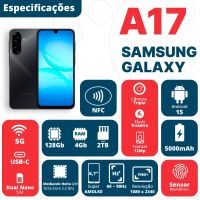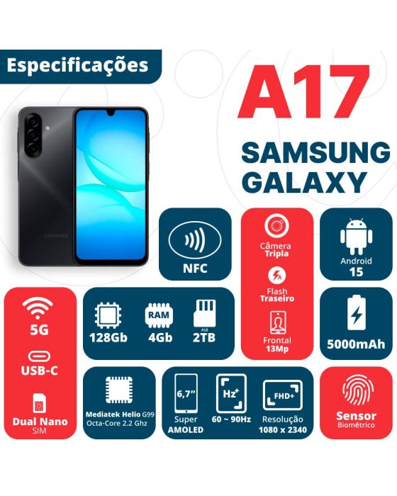 Características:- Equilíbrio entre desempenho, tela avançada e durabilidade: O Samsung Galaxy A17 4G é um smartphone desenvolvido para usuários que buscam confiabilidade, boa performance no dia a dia e longa vida útil, aliado a recursos inteligentes baseados em AI. Na cor preta, apresenta design fino e moderno, com construção resistente, adequado tanto para uso pessoal quanto profissional.- Tela Super AMOLED touch screen com alta qualidade de imagem: Equipado com tela touch screen Super AMOLED de 6,7”, resolução FHD+ (1080 x 2340) e taxa de atualização de até 90 Hz, o Galaxy A17 entrega imagens nítidas, cores vivas e excelente fluidez. A tela ampla é ideal para navegação, consumo de vídeos, estudos, redes sociais e aplicações corporativas.- Desempenho eficiente com processador Octa Core: O modelo conta com o processador Samsung Exynos 1330 Octa Core, com velocidades de até 2,4 GHz, garantindo desempenho estável para multitarefas, aplicativos, streaming e jogos leves a moderados. Possui 4 GB de memória RAM e 128 GB de armazenamento interno, expansível via microSD de até 2 TB, oferecendo bom espaço para arquivos, fotos e aplicativos.- Sistema de câmeras versátil com estabilização óptica: O conjunto de câmeras traseiras triplas (50 MP + 5 MP Ultra Wide + 2 MP Macro) permite capturar imagens em diferentes cenários, desde paisagens amplas até detalhes de perto. A estabilização óptica de imagem (OIS) contribui para fotos mais nítidas e vídeos estáveis, inclusive em ambientes com pouca luz. A câmera frontal de 13 MP é indicada para selfies, chamadas de vídeo e reuniões online. A gravação de vídeos ocorre em Full HD a 30 fps.- Conectividade 4G, resistência e bateria de longa duração: Compatível com 4G LTE, Wi-Fi dual band e Bluetooth 5.3, o Galaxy A17 oferece conectividade estável para o uso cotidiano. Possui certificação IP54, que garante resistência contra poeira e respingos de água, além de vidro Corning® Gorilla® Glass Victus®, aumentando a proteção contra riscos. A bateria de 5.000 mAh, não removível, proporciona até 18 horas de reprodução de vídeo, suportando longos períodos de uso. O carregamento é feito via USB Tipo-C, com compatibilidade bivolt (via carregador USB).- Sistema, sensores e atualizações: Rodando Android, o smartphone conta com sensores essenciais, incluindo leitor de impressão digital, giroscópio e sensores de proximidade e luz. Foi projetado para oferecer até 6 atualizações de sistema operacional e 6 anos de atualizações de segurança, reforçando a durabilidade e a proteção de dados.- Aplicações e uso recomendado: Indicado para uso pessoal, educacional e profissional, o Galaxy A17 4G atende bem atividades como comunicação, estudos, trabalho remoto, entretenimento, redes sociais e uso de aplicativos do dia a dia.- Sobre a marca Samsung: A Samsung é referência mundial em tecnologia e inovação, reconhecida pela qualidade, durabilidade e constante evolução de seus dispositivos móveis.- Itens inclusos na embalagem: 1 Samsung Galaxy A17, 1 Carregador, 1 Cabo USB-C, 1 Extrator de chip e 1 manual do usuário.- Garantia do fornecedor: 1 ano contra defeitos de fabricação.- Dimensões do produto: Comprimento: 11,5cm; Largura: 2,5cm; Altura: 1cm; Peso: 55g.* As especificações podem ser alteradas sem aviso prévio ** Imagem meramente ilustrativa.