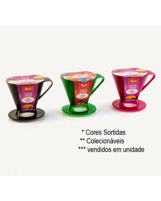 Características:- Suporte PLástico para Filtro de Café 102 (pequeno)- Marca: Melitta®- Cor do Suporte: Cores Diversas / Sortidas (Marrom, Verde, Rosa, Roxa etc...)- Os Suportes para Filtros Melitta® são ideais para passar o café de forma manual, sem deixar a praticidade de lado.- Ideal para passar o seu café de forma manual, sem deixar a praticidade de lado. - Encaixam-se perfeitamente na Garrafa Térmica Melitta® - Para melhor encaixe dobre o filtro de papel 103 nas áreas indicadas.Cores sortidas, será enviado de acordo com a disponibilidade do estoque. Não é possível escolher uma cor específica.* Imagens meramente Ilustrativas