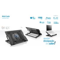 Caracteristicas:- Superfície de Metal- 2 Portas USB- 4 Ângulos ajustáveis: Cooler com 12,5cm- LED Luminoso- Compatível com Notebook de 9-17- Velocidade do Cooler: 700-1500 RPM- Taxa de ruído: 15 dBA- Dimensões: 65x370x265mm- Peso: 791g- Conteúdo da Emabalagem: 1 Cooler, 1 Cabo USB, 2 Clips- Garantia: 1 Ano contra defeitos de fabricação* As especificações podem ser alteradas sem aviso prévio ** Imagem meramente ilustrativa. Não Acompanha Notebook
