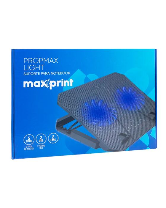 Características:Suporte para notebook PropMax Light 2 fans auxilia na escolha da posição do seu notebook, facilitando esse ajuste com disponibilidade de 5 posições para o ângulo desejado. Com 2 hélices de ventilação de 1200RPM que ajuda na dissipação do calor, aumentando a vida útil do seu notebook.Detalhes:- Marca: Maxprint;- Modelo: PropMax Light;- Referência: 60000117;- Linha: Suporte para Notebook;- Tipo: Com ventilador;- Cor: Preto;- Alimentação: USB 2.0;- Contém: 1 unidade do produto;- Leds indicativos;- Teclas confortáveis;- Ajuste de altura;- USB 2.0;- Cabo de 22cm.Fabricado na China. | Validade: Indeterminada.Geral:- Suporta até: 15,6 polegadas;- Entradas USB: 2;- 5 tipos de ajustes.Ventilação:- Velocidade de ventilação: 800 - 1200 RPM;- Fluxo de ar: 38 FCM;- 2 hélices de ventilação.Compatibilidade: - Windows XP, Windows Vista, Windows 7 e superior, MAC e Linux.Composição:- Plástico e metal trançado.Medidas:- Dimensões do produto: 36,2 x 26,7 x 3cm (CxLxA);- Dimensões da embalagem: 45 x 14 x 2,7cm (CxLxA);- Peso: 600g.Conteúdo da embalagem: 1 suporte para notebook OPropMax Light 60000117 Maxprint e 1 cabo USB.Garantia do fornecedor: 1 ano contra defeitos de fabricação.* As especificações podem ser alteradas sem aviso prévio ** Imagem meramente ilustrativa.
