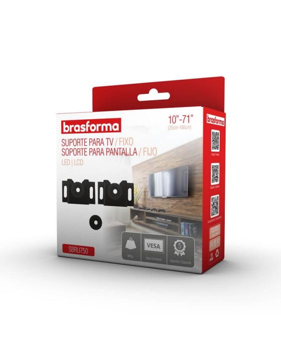 CaraterísticasO Suporte da Brasforma é o acessório ideal para você que deseja espaço e organização na sua casa. Suporta até 40kg e você pode instalar com praticidade sua TV na parede. Indicado para aparelhos de 10 a 71 polegadas.- Tipo: FIXO- Polegadas: 10 - 71- Distância mínima da parede: 3 cm- Distância máxima da parede: 3 cm- Local de Instalação: Parede- Furação: VESA Universal- Pontos de Fixação: 2 pontos- Parafusos: M4X16mm, M6X20mm e M8X25mm- Capacidade de Carga: 40kg- Material: Aço carbono- Fácil instalação- Cor: Preto- Peso: 0,20kg- Garantia: 5 anos de garantia contra defeitos de fabricação através do suporte Brasforma (11) 2246-0222 ou [email protected]- Conteúdo da Embalagem: 1 Suporte para TV Brasforma SBRU750, Kit de Parafusos e 1 Manual de instruçõesObservações:- Verifique se a superfície de instalação apresenta resistência suficiente para uma instalação segura.- Fique atento a carga máxima indicada para o suporte.- Aconselhamos que a instalação seja realizada por um profissional da área.- Verifique se a furação de sua TV é compatível com o suporte. * As especificações podem ser alteradas sem aviso prévio ** Imagem meramente ilustrativa.