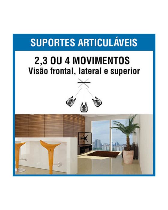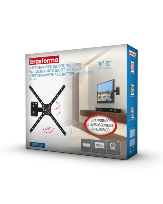 CaraterísticasSuporte Articulado Brasforma para TVs LCD, LED, Plasma, 3D e Smart TV de 10 até 55 polegadas (com VESA máximo de 400x400mm). Permite articulação, inclinação e rotação de 360º graus da base (4 movimentos). Permite Ajustar a TV para assistir de vários ângulos. Ideal para salas, escritórios, quartos, hospitais, restaurantes, entre outros locais. Permite visão modo retrato e paisagem e já vem montado!- Local de Instalação: Parede- Inclinação: 15°- Articulação: 130°- ARTICULÁVEL E INCLINÁVEL - Para visão frontal, lateral e superior- Distância mínima da parede: 6,5cm- Distância máxima da parede: 23cm- Pontos de Fixação: 4 pontos- Suporta TV´s de 10 - 55- Capacidade de Carga: 30kg- Furação VESA: 50x50, 75x75, 100x100, 200x100, 200x200, 300x200, 300x300, 400x100, 400x400mm- Cor: Preto- Peso: 1,27kg- Dimensões do Produto (LxAxP): 400x400x80 mm- Material: Aço carbono, tratamento anticorrosivo e pintura eletrostática- Garantia: 5 anos de garantia contra defeitos de fabricação através do suporte Brasforma (11) 2246-0222 ou [email protected]- Conteúdo da Embalagem: 1 Suporte para TV, Hastes extensoras para VESA 400x400mm, Kit de Parafusos, 1 Nível de bolha e 1 Manual de instruções- Verifique se a superfície de instalação apresenta resistência suficiente para uma instalação segura.- Fique atento a carga máxima indicada para o suporte.- Aconselhamos que a instalação seja realizada por um profissional da área.- Verifique se a furação de sua TV é compatível com o suporte.** As especificações podem ser alteradas sem aviso prévio *** Imagem meramente ilustrativa.