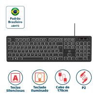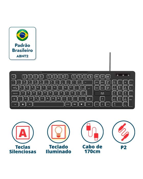 Características:- Desempenho silencioso e visual moderno com iluminação ajustável: O teclado com fio TC268 da Multi oferece uma experiência de digitação confortável e silenciosa, ideal para escritórios, home office ou uso pessoal. Equipado com teclas macias e perfil slim, proporciona agilidade no uso diário com ergonomia aprimorada por meio de regulagem de altura. A iluminação LED ajustável oferece visibilidade em ambientes com pouca luz e um toque visual moderno à estação de trabalho.- Recursos multimídia e layout ABNT2 completo: Conta com 107 teclas, sendo 12 de atalho multimídia para controle rápido de volume, mídia e funções do sistema. O layout ABNT2 com tecla “Ç” atende ao padrão brasileiro, garantindo compatibilidade com o idioma e facilidade de adaptação.- Cabo de 1,70m e conectividade USB Plug & Play: O modelo TC268 possui cabo com 1,70 metro de comprimento e conexão USB, garantindo praticidade na instalação e compatibilidade com sistemas atuais sem necessidade de drivers adicionais.- Compatibilidade e aplicação: Compatível com sistemas Windows 10 ou superior e MacOS, é indicado para usuários que buscam um teclado funcional, silencioso e com visual atrativo, ideal para rotinas de trabalho, estudos ou entretenimento.- Marca e confiabilidade: Com foco em inovação e usabilidade, os produtos Multi são desenvolvidos para facilitar o dia a dia, sempre com atenção à segurança, eficiência e custo-benefício.- Dimensões do produto:Comprimento: 43cm;Largura: 13,2cm;Altura: 2,3cm;Peso: 500g.- Conteúdo da embalagem: 1 teclado com fio TC268 Multi.* As especificações podem ser alteradas sem aviso prévio ** Imagem meramente ilustrativa.
