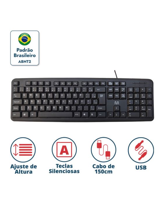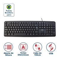 Características:- Design fino, portátil e funcional para o uso diário: O Teclado com Fio USB TC065 da Multi é uma solução prática para quem busca conforto e economia de espaço. Seu design slim e leve facilita o transporte e a organização da mesa, sendo ideal tanto para ambientes residenciais quanto corporativos.- Teclas macias e silenciosas para digitação confortável: Equipado com 107 teclas no padrão ABNT2, o teclado oferece uma digitação suave e silenciosa, contribuindo para o bem-estar durante longos períodos de uso.- Conexão USB com cabo de 1,5 metro e tecnologia Plug & Play: Possui cabo extra-longo de 1,50 metro com conexão USB. A instalação é automática e imediata, bastando conectar à porta USB para começar a utilizar.- Compatível com múltiplos sistemas operacionais: Sua ampla compatibilidade com Windows, Linux e MacOS permite uso em diferentes configurações de trabalho ou estudo, sem necessidade de drivers adicionais.- Marca e confiabilidade: Com foco em inovação e usabilidade, os produtos Multi são desenvolvidos para facilitar o dia a dia, sempre com atenção à segurança, eficiência e custo-benefício.- Dimensões do produto:Comprimento: 46cm;Largura: 14,5cm;Altura: 2cm;Peso: 418g.- Garantia do fornecedor: 3 anos contra defeitos de fabricação.- Conteúdo da embalagem: 1 Teclado Com Fio USB Slim Preto TC065 Multi.* As especificações podem ser alteradas sem aviso prévio ** Imagem meramente ilustrativa
