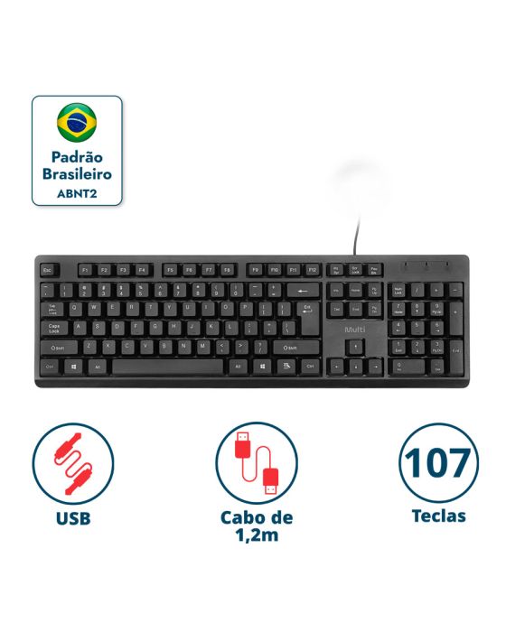 Características:- Teclado com fio USB de alta durabilidade para uso diário em escritórios, estudos e rotinas corporativas: O Teclado TF600 da Multi é uma solução prática e confiável para quem busca eficiência e conforto durante longas horas de digitação. Com construção em ABS resistente e design fino, ele oferece leveza, ergonomia e uma experiência de uso fluida, ideal para ambientes profissionais, educacionais ou domésticos.- Layout ABNT2 com 107 teclas para digitação precisa e intuitiva: Equipado com 107 teclas no padrão ABNT2, o TF600 garante facilidade na digitação em português, incluindo cedilha e teclas de atalho essenciais para produtividade. O acionamento é suave e silencioso, adequado tanto para escritórios quanto para estudos. Os LEDs indicadores permitem visualizar rapidamente status de funções como Caps Lock, Num Lock e Scroll Lock. Conexão USB estável e cabo de 1,2 m para maior alcance: Com cabo de 1,2 metro, o teclado oferece flexibilidade para organização da mesa, permitindo posicionamento confortável mesmo em setups maiores. Sua conexão USB é plug and play, dispensando drivers, funcionando em PCs, notebooks e sistemas compatíveis com entrada USB. Ergonomia aprimorada e ajuste de altura: O design fino e leve contribui para uma postura mais confortável. Conta ainda com regulagem de altura traseira, proporcionando a inclinação ideal para reduzir fadiga durante longos períodos de uso.- Aplicações recomendadas: Indicado para escritórios, empresas, escolas, home office, laboratórios de informática e ambientes que exigem digitação frequente. Ideal para tarefas administrativas, produção de textos, navegação e atividades educacionais.- Marca e confiabilidade: Com foco em inovação e usabilidade, os produtos Multi são desenvolvidos para facilitar o dia a dia, sempre com atenção à segurança, eficiência e custo-benefício.- Itens inclusos na embalagem: 1 teclado com fio TF600.- Garantia do fornecedor: 3 anos contra defeitos e fabricação.- Dimensões do produto: Comprimento: 44cm; Largura: 13,5cm; Altura: 2,6cm; Peso: 465g.* As especificações podem ser alteradas sem aviso prévio ** Imagem meramente ilustrativa.