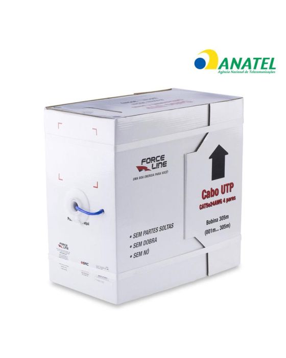 Características- Comprimento do Cabo: 305m (caixa com rolo)- Cabo: (100 Ohms - Categoria 5e, Classe CMX)- Cor do cabo: Azul- Norma do cabo: ANSI TIA/EIA-568-B.2 (2001). ANSI TIA/EIA-568-B.2-2 (2001). ANSI TIA/EIA-568-B.2-11 (2005). ABNT NBR 14703:2005. ABNT NBR 9141:1998. ABNT NBR 9148:1998. ABNT NBR 14705:2006- Condutores: Constituído de condutores sólidos de cobre 4 x 24AWG, maciço, núcleo seco- Isolação: Em termoplásticos- Capa: PVC- Diâmetro (bitola): 24AWG- Capacidade: até 4 pares- Banda: Passante até 100 MHz- Utilização: Para transmissão de dados utilizados em redes locais de computadores- Tipo de embalagem: Caixa- Peso total: 6,65kg- Tamanho da embalagem: 35 x 35 x 20cm- Garantia: 3 meses contra defeitos de fabricação- SAC Force Line: Atendimento ao consumidor através do (11) 2799-7747 ou [email protected] (Email/Skype)* As especificações podem ser alteradas sem aviso prévio ** Imagem meramente ilustrativa.