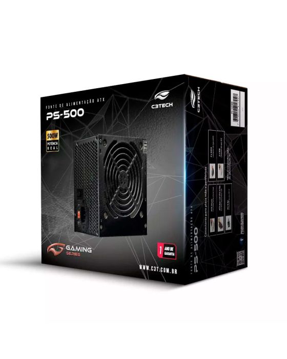 Características:Com a Fonte ATX 500W PS-500BK C3TECH você garante maior qualidade e desempenho ao seu computador, esta fonte é ideal para computadores de pequeno porte e oferece 500W Watts de potencia ao seu computador, tornando-a uma das melhores opcoes do mercado.Detalhes:- Marca: C3TECH;- Modelo: ATX 500W;- Referência: PS-500BK;- Linha: Fontes;- Tipo: Sem cabo;- Cor: Preta;- Contém: 1 unidade do produto;- Este modelo apresenta uma potencia de 500 Watts, consegue fornecer ate 30A de corrente em 12V atendendo a necessidade da maioria das placas de video do mercado, bivolt com chaveamento manual, protecao interna contra curto-circuito, alem de ventilador ultra silencioso de 120mm;- Garanta o melhor desempenho e resfriamento ideal para seu computador com a fonte PS-500 da C3 Tech.Características fonte:- Potência Real: 500W;- Tamanho de Ventilador: 120mm;- Bivolt Automático: Manual;- Possui Interruptor ON/OFF: Sim;- Possui PFC Ativo: Não;- Modular: Não;- Possui Certificação 80PLUS: Não;- Nível de Certificação 80PLUS: Não;- Outras Certificações: CE, FCC, RoHS.Cabo DC e conectores:- Conector ATX 20+4P: 1;- Conector ATX AUX 12V 4P: 1;- Conector IDE: 2;- Conector SATA: 2;- Conector PCI Express 6P: 1;- Conector PCI Express 6+2P: 0;- Conector Floppy: 1.Características elétricas:- Tensão de Operação: AC 115/230V;- Corrente de Saída 3,3V: 10A;- Corrente de Saída 5V: 15A;- Corrente de Saída 12V: 32A;- Corrente de Saída -12V: 0,3A;- Corrente de Saída 5VSB: 2,5A;- Frequência: 50/60Hz;- MTBT: 100.000 horas / 25°c.Medidas:- Dimensões do produto: 8,5 x 15 x 14cm (AxLxC);- Dimensões da embalagem: 12 x 23 x 20cm (AxLxC);- Peso da embalagem: 1405g.Garantia do fornecedor: 1 ano contra defeitos de fabricação.Conteúdo da embalagem: 01 Fonte PS-500BK 500W.* As especificações podem ser alteradas sem aviso prévio ** Imagem meramente ilustrativa.