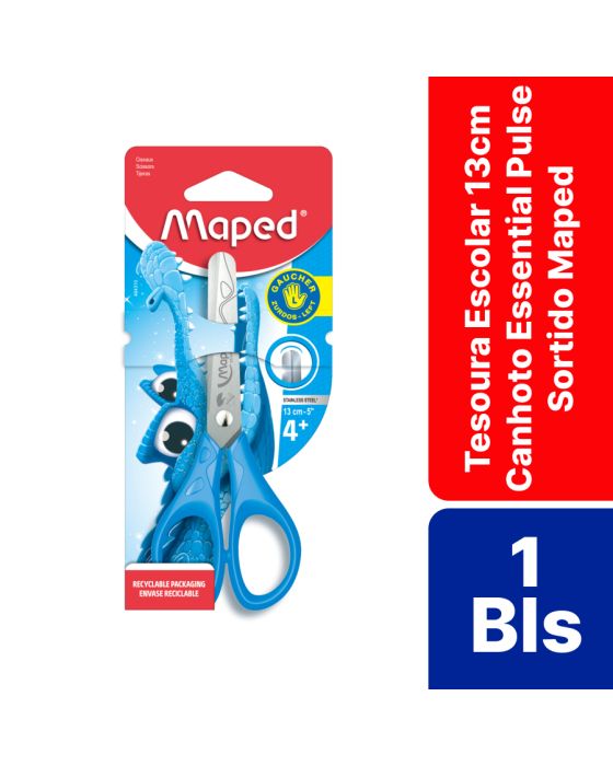 Características:As Tesouras Escolares Maped Essentials são ergonômicas ideais para crianças. Elas apresentam lâminas de aço inoxidável e pontas arredondadas para segurança!Detalhes:- Marca: Maped;- Modelo: Essentials Pulse;- Referência: 46431000;- Linha: Tesouras;- Cores: azul, rosa e verde (Cores sortidas);- Contém: 1 blister com 1 unidade do produto;- Alças ergonômicas;- Lâminas decoradas;- Lâminas com pontas arredondadas.Fabricado na China | Validade: Indeterminada.Recomendação:- Recomendado para crianças à partir de 4 anos de idade.Composição:- Fabricado em poliestireno e Lâmina de aço.Medidas:- Dimensões da embalagem: 16,9 x 7,5 x 1cm (CxLxA);- Dimensões do produto: 13 x 5,4 x 0,6 (CxLxA).Cores sortidas, será enviado de acordo com a disponibilidade do estoque. Não é possível escolher uma cor específica.* As especificações podem ser alteradas sem aviso prévio ** Imagem meramente ilustrativa.