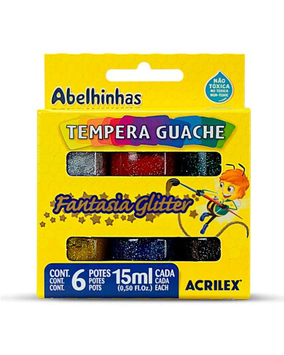 Características:A Têmpera Guache Acrilex é um importante instrumento para o desenvolvimento da criatividade, coordenação motora e percepção visual das cores.Detalhes:- Marca: Acrilex.- Modelo: Fantasia Glitter.- Referência: 2001.- Linha: Tinta Guache com glitter.- Cor: Branco, Amarelo, Vermelho, Azul, Verde e Preto (todas as cores com glitter).- Contém: 1 embalagem com 6 unidades com cores mistas.- Volume: 15ml cada pote.- Aroma: Tutti-Frutti.- Não Tóxica.- Solúvel em água.- Possui brilho intenso.- Tampe após o uso.Aplicação: - Pode ser aplicada em papel, papel cartão, cartolina, gesso, madeira e cerâmica.Composição:- Resina, Água, Carga, Pigmentos, Glitter e Conservante.Conservação:- Conserve em locla fresco e ventilado.Atenção! Produto não indicado para uso na pele. Agite antes de usar.Como outras tintas, pode manchar tecidos.* As especificações podem ser alteradas sem aviso prévio ** Imagem meramente ilustrativa