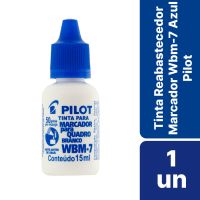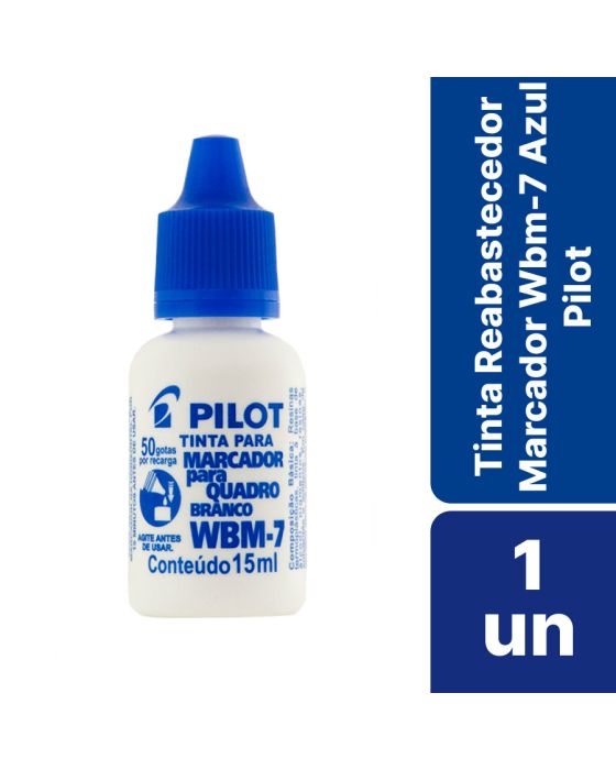 Características:A Tinta para Marcador de Quadro Branco WBM-7 é uma fórmula desenvolvida sob medida para o Marcador de Quadro Branco WBM-7 da PILOT. Com propriedades cuidadosamente selecionadas, essa tinta é projetada para manter e prolongar as qualidades excepcionais do seu marcador, garantindo uma escrita suave e marcante.Ao recarregar o seu marcador WBM-7 com esta tinta, você garante qualidade da escrita e a durabilidade e a garantia do seu produto. Poucas gotas são necessárias para a recarga, de forma que 50 gotinhas realizam uma recarga completa do WMB-7.Detalhes:- Marca: Pilot;- Modelo: WBM-7;- Referência: 1060001;- Linha: Tintas para Marcador;- Volume: 15ml;- Cor: Azul;- Contém: 1 unidade do produto;- Tinta permanente;- Desenvolvida para manter as qualidades do marcador usado e prolongar sua vida útil.Observações:- Ao utilizar outra tinta a não ser esta, toda a garantia do marcador estará perdida;- Usar qualquer outro modelo de tinta (mesmo que seja da PILOT) pode causar entupimento no marcador e prejudicar o seu funcionamento.Armazenagem:- Evite expor o produto em temperaturas acima de 45?°C e exposição direta aos raios solares;- Armazene o produto em local seco e arejado para garantir a integridade da tinta;- Em caso de contato com os olhos ou ingestão, consulte um médico imediatamente;- Em contato com a pele, lave abundantemente com água e sabão;- Mantenha fora do alcance de crianças.Composição:- Resinas Termoplásticas, Tinta base de álcool, pigmentos, resinas, solventes e aditivos (preparado).ATENÇÃO! MANTENHA FORA DO ALCANCE DAS CRIANÇAS E DOS ANIMAIS DOMÉSTICOS.* As especificações podem ser alteradas sem aviso prévio ** Imagem meramente ilustrativa.