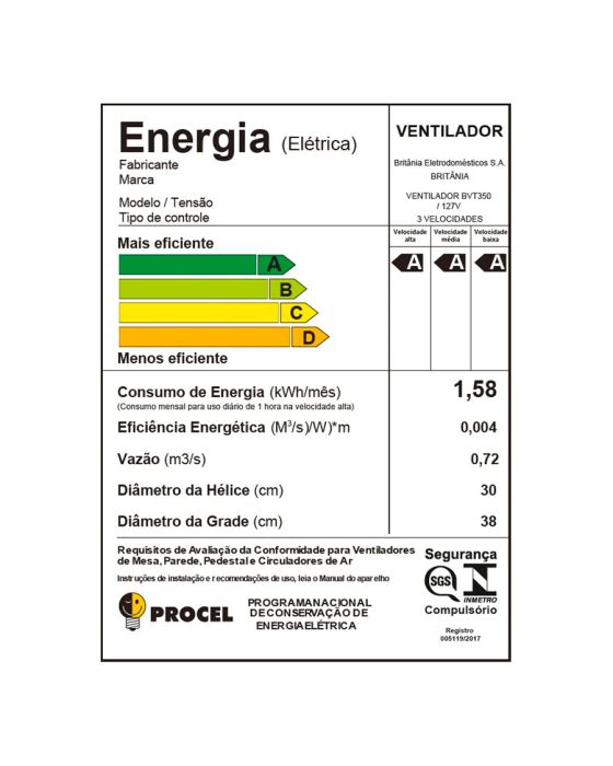 Características:Com três velocidades, você pode ajustar a intensidade da ventilação do seu Ventilador Britânia de acordo com as necessidades do ambiente. Já a hélice de 6 pás com diâmetro de 30cm, garante um excelente desempenho de ventilação, enquanto a potência de 75W refresca o ambiente com eficiência. Equipado de um motor com sistema que interrompe o funcionamento do produto quando houver superaquecimento, você tem maior segurança.Outro diferencial do ventilador de coluna Britânia, são as 3 opções de oscilação vertical, coluna com ajuste de altura telescópico de até 14cm e oscilação horizontal automática, proporcionando total flexibilidade. Tudo isso, com baixo nível de ruído e baixo consumo de energia elétrica. Ou seja, sinta o conforto e gaste menos!Com todas essas características, o Ventilador de Coluna Britânia BVT350 é a escolha perfeita para quem busca qualidade e praticidade em um só aparelho.Detalhes:- Marca: Britânia;- Modelo: Maxx Force;- Referência: BVT350;- Linha: Ventiladores;- Cor: Preto;- Tensão: 127V;- Potência: 75W;- Tipo de instalação: De coluna;- Contém: 1 unidade do produto;- Número de velocidades: 3 velocidades (mínimo, média e máxima);- Quantidade de pás: 6 pás;- Hélice com diâmetro de 30 cm;- Grade com diâmetro de 38cm;- Tecnologia Maxx Force;- Mais força, vento, potência, versatilidade e silencio.Diferenciais:- Coluna telescópica com altura ajustável até 14 cm- Grade removível: fácil de montar, desmontar e limpar;- Oscilação horizontal automática e inclinação vertical regulável;- 3 opções de oscilações vertical;- Baixo consumo de energia elétrica;- Baixo nível de ruído.Energia:- Tensão: 127V;- Potência: 75W;- Consumo de energia: 1,58 Kwh/mês.Medidas:- Dimensões do produto: 38 x 36 x 97,8cm (CxLxA);- Dimensões da embalagem: 43,9 x 15,2 x 49cm (CxLxA);- Peso do produto: 3,975kg;- Peso da embalagem: 4,297kg.Conteúdo da embalagem: 1 ventilador e 1 manual de instruções.Garantia do fornecedor: 1 ano contra defeitos de fabricação.* As especificações podem ser alteradas sem aviso prévio ** Imagem meramente ilustrativa.