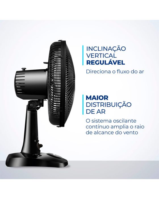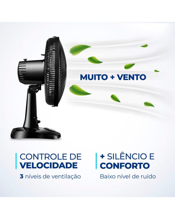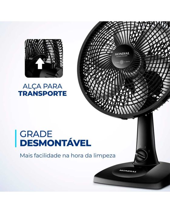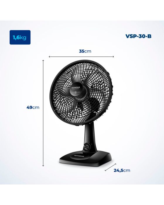 Características:O ventilador Super Power VSP-30-B possui 30 cm de diâmetro e hélice com 6 pás, garantindo um ambiente mais refrescante e agradável. O Sistema Oscilante Contínuo amplia o raio do vento no ambiente e a Inclinação Vertical Regulável é perfeita para o direcionamento do fluxo de ar. Possui design aliado á potência, promovendo maior intensidade do vento e garantia de um ambiente fresco e agradável, além de apresentar baixo nível de ruído para refrescar nos momentos de concentração e sem atrapalhar o seu sono!Detalhes:- Marca: Mondial;- Modelo: Super Power;- Referência: VSP-30-B;- Linha: Ventiladores;- Cor: Preto;- Tensão: 220V;- Tipo de instalação: De mesa;- Quantidade de pás: 6 pás;- Contém: 1 unidade do produto;- Número de velocidades: 3 velocidades;- Grade plástica removível e muito fácil de limpar;- Possui alça para transporte.Ventilador:- Vento Super Power: A linha de Ventiladores Super Power possui 30cm de diâmetro e 6 Pás. O design, aliado à potência, promove maior intensidade do vento e é garantia de um ambiente fresco e agradável;- Mais Silêncio e Conforto: O sistema de ventilação da Mondial apresenta baixo nível de ruído, assegurando o silêncio necessário para momentos de concentração e uma excelente noite de sono;- Maior Distribuição de Ar: O Sistema Oscilante Contínuo amplia o raio de alcance do vento no ambiente, permitindo uma distribuição de ar mais eficiente nos cômodos da casa;- Inclinação Vertical Regulável: Para um direcionamento ideal do fluxo do ar;- Controle de Velocidade: As 3 opções de velocidade permitem adequar o vento à sua necessidade: Máxima Turbo, Média Conforto e Mínima Silencioso;- Facilidade na Limpeza: A grade frontal removível oferece mais facilidade na limpeza das hélices, o que simplifica a lavagem e a remoção de poeira, e garante melhor qualidade do ar;- Alça de Transporte + Porta-Fio: Além do design compacto, a alça traseira permite que o ventilador seja transportado entre os cômodos da casa com facilidade. Com o porta-fio embutido, você armazena o fio elétrico dentro do aparelho após o uso.Energia:- Tensão: 220V;- Potência: 60W.Medidas:- Dimensões do produto: 49 x 35 x 24,5cm (AxLxP);- Peso: 1,670kg.Conteúdo da embalagem: 01 Ventilador de Mesa Super Power 30cm 6 Pás VSP-30-B 220V Mondial e Manual de Instruções.Garantia do fornecedor: 1 ano contra defeitos de fabricação.* As especificações podem ser alteradas sem aviso prévio** Imagem meramente ilustrativa.