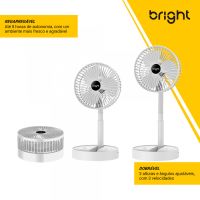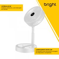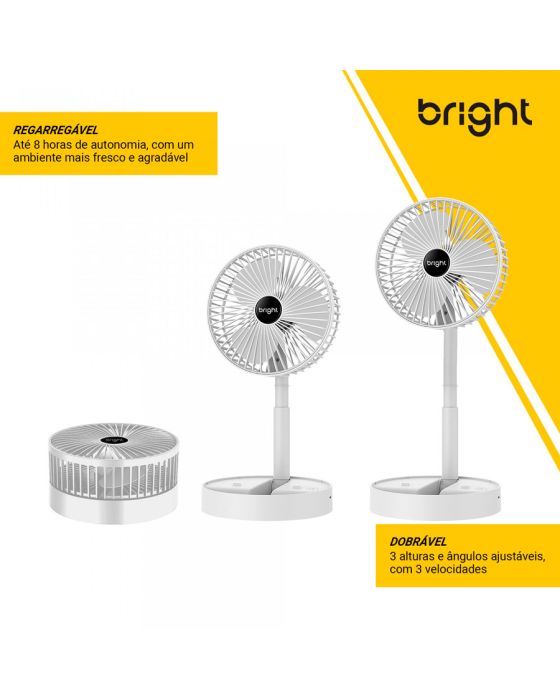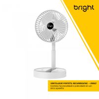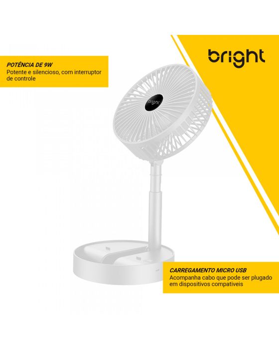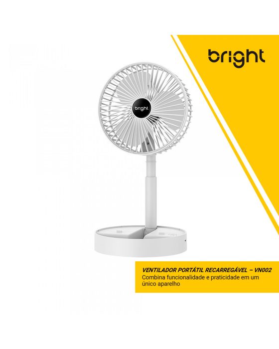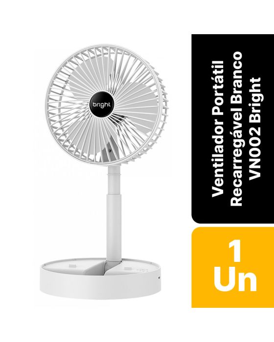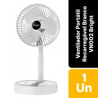 Características:Com o Ventilador Portátil Recarregável Bright é ideal para afastar o calor e manter o seu ambiente, seja em casa, escritório ou home office, mais arejado!É um ventilador prático e de fácil transporte, possui 3 pás, potência de 9v, ajuste manual de direção 180º, botão liga/desliga, além de ser inclinável e silencioso.Detalhes:- Marca: Bright;- Modelo: Ventilador Portátil Recarregável;- Referência: VN002;- Linha: Ventiladores Portáteis;- Cor: Branco;- Quantidade de pás: 3 pás;- Contém: 1 unidade do produto;- Recarregável: Autonomia de até 8 horas;- Articulado: Direcione o vento para onde quiser;- Dobrável: se torna compacto para guardar;- Altura ajustável: de 3cm até 36cm;- Silencioso com apoio para celular;- Potente.Energia:- Potencia: 4,5W;- Voltagem: 5V;- Porta de carregamento Tipo C;- Capacidade da bateria: 800mAh;- Ruído: 40db.Composição:- Fabricado em ABS.Medidas:- Dimensões do produto “esticado”: 8,5 x 16,5 x 16,5cm (AxLxP);- Dimensões do produto dobrado: 30 x 16,5 x 16,5cm (AxLxP);- Peso: 305g.Conteúdo da embalagem: 01 Ventilador Bright e 01 Cabo de Carregamento.Garantia do fornecedor: 1 ano contra defeitos de frabriçação.* As especificações podem ser alteradas sem aviso prévio ** Imagem meramente ilustrativa.